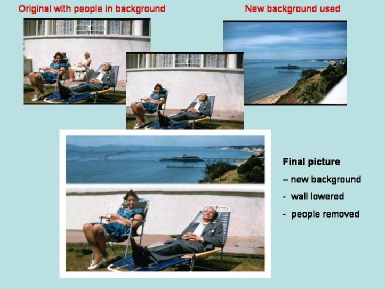 Restoration, rebuilding any damaged, torn or discoloured areas of a picture (photo, slide or negative) can also be carried out at very reasonable costs. Also background or foreground changes and unwanted objects can be removed, or people added from other photos. see Restoration page