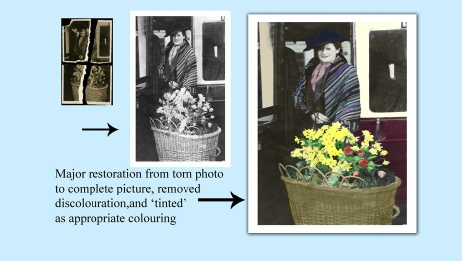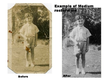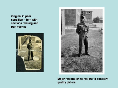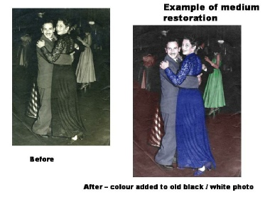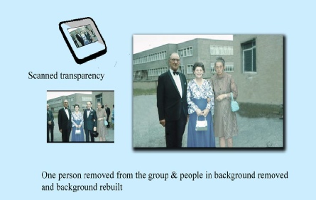 Restoration, rebuilding any damaged, torn or discoloured areas of a picture (photo, slide or negative) can also be carried out at very reasonable costs. Also background or foreground changes and unwanted objects can be removed, or people added from other photos. see Restoration page